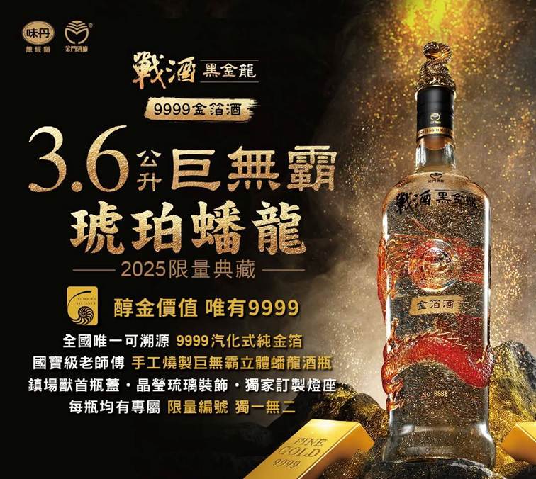 象徵力量與榮耀的收藏級佳釀,以豪華氣勢與極致工藝打造而成。瓶身以「蟠龍」為意象,象徵祥瑞與權勢,金箔隨琥珀色酒液在瓶中流轉,閃耀出如龍鱗般的光輝。台灣之光金門酒廠重量級收藏品,大氣磅礡,現買現賺,酒友們把握機會!